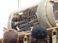 Den Höhepunkt des "Tag des Helfers" stellte die gemeinsame Einsatzübung von THW, der Rettungshundestaffel Oberrhein und dem DRK dar. In einer eindrucksvollen Vorführung wurde die Bergung einer verschütteten Person dargestellt. Um den zahlreich anwesenden Zuschauern eine bessere Sicht zu ermöglichen, wurde die in zwei Abwasserrohren nachgestellte Trümmerstrecke zuvor mit einem aus D-Brückenmaterial speziell gefertigtem Gerüst erhöht. Mit Brennschneidarbeiten, der Säbelsäge zur Holzbearbeitung, einer Betonkettensäge und einfachen Schaufeln wurde der Zugang zum zuvor durch die Rettunghundestaffel georteten Verletzten freigeräumt. Dieser wurde mittels Bergewanne und Dreibock emporgehoben und mittels einer Seilbahn außerhalb der simulierten Gefahrenzone gebracht. Dort wurde er in die Hände des DRK´s übergeben. Diese insgesamt knapp eine Stunde dauernde Einsatzübung verdeutlichte den Zuschauern die verschiedenen Einsatzmöglichkeiten der einzelnen Hilforganisationen und deren reibungslose Zusammenarbeit.Ebenso interessiert beobachtete und filmte ein Kamerateam des FR-TV Südbadens die ganze Szenerie.