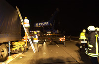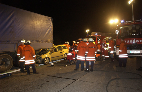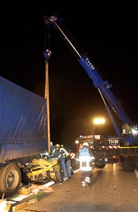 Zu einem Verkehrsunfall auf der BAB 5 kurz vor der Autobahnausfahrt Neuenburg Süd, wurde das THW Müllheim am 5. Februar um kurz vor 22 Uhr gerufen. Ein Auto war auf einen LKW aufgefahren, unter dem Sattelauflieger eingeklemmt und daraufhin 270 Meter weit mitgeschleift worden. Zwei Personen wurden schwer verletzt. Eine weitere Person verstarb noch an der Unfallstelle. Die beiden Verletzten, Fahrer und Beifahrer, wuden von der Feuerwehr aus dem Autowrack herausgeschnitten und mit Rettungshelikoptern abtransportiert.