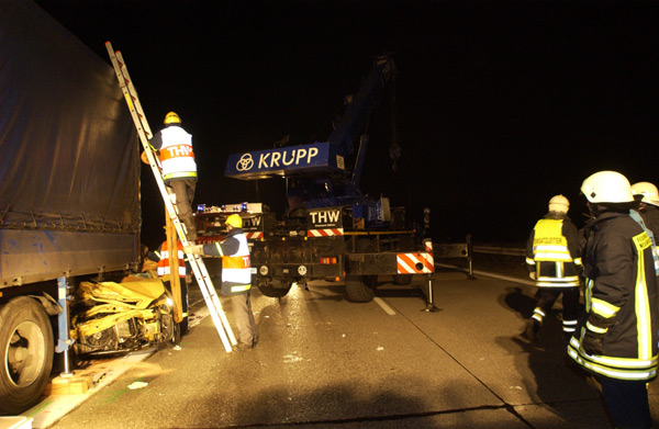 Um den unter dem Auflieger verkeilten PKW zu bergen, wurde das THW Müllheim alarmiert. Bereits nach 15 Minuten erreichte das THW Müllheim mit neun Helfern, einem Gerätewagen (GKW I) und dem Autokran den Einsatzort. Der Auflieger wurde mit dem Kran angehoben und das eingeklemmte Fahrzeug per Seilwinde herausgezogen. Um dies zu ermöglichen wurde mit dem Schweißbrenner ein Stück des verbogenen Aufliegers entfernt. Die bei den Bergungsarbeiten voll gesperrte Autobahn konnte nach 4 Stunden wieder freigegeben werden.