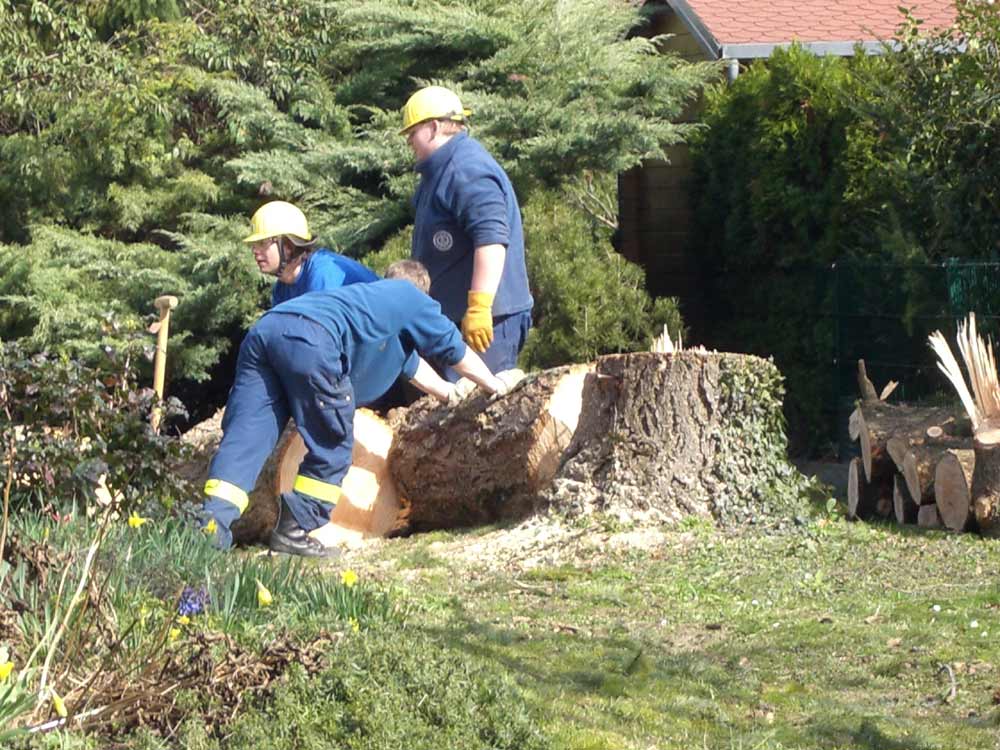 Am 1. April hatte das THW Müllheim einen erneuten Baumfälleinsatz. Ein 15 Meter hoher Baum sollten von den 5 Helfer über den Samstag Vormittag gefällt, zerkleinert und abtransportiert werden. Anfangs kletterte ein Helfer den Baum hinauf, um die Äste von oben herab zu entfernen. Danach wurde der Baum mit einem Greifzug auf halber Höhe gesichert. Das Drahtseil diente ebenfalls dazu, den Baum beim fällen in die gewünschte Richtung zu ziehen. Gegen Mittag wurde der Baum vollends gefällt. Abschließend wurde der Stamm in kleine Stücke zersägt und mit den Ästen abtransportiert. Zuletzt wurde die Baustelle gereinigt und die Fahrzeuge wieder einsatzbereit gemacht.
