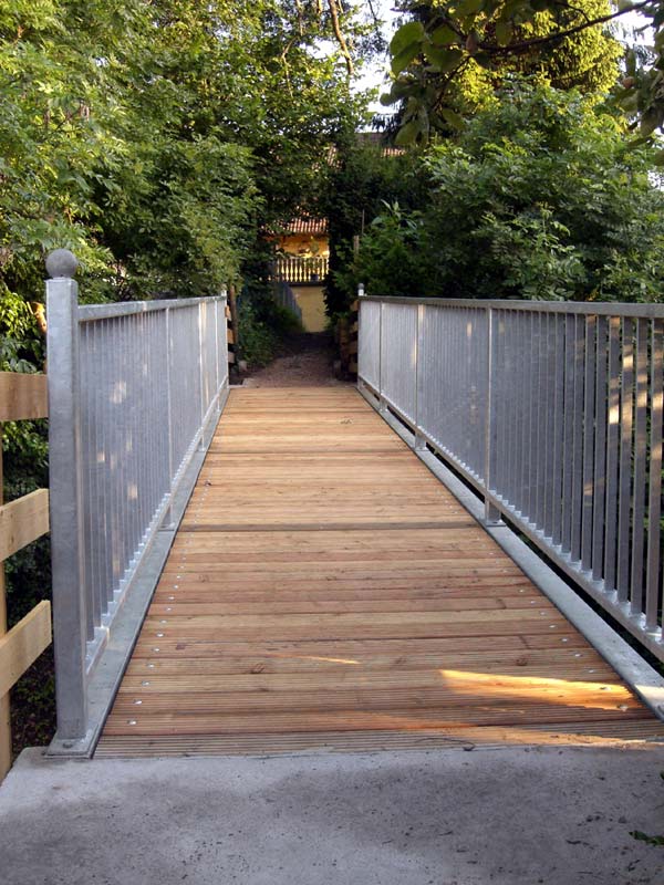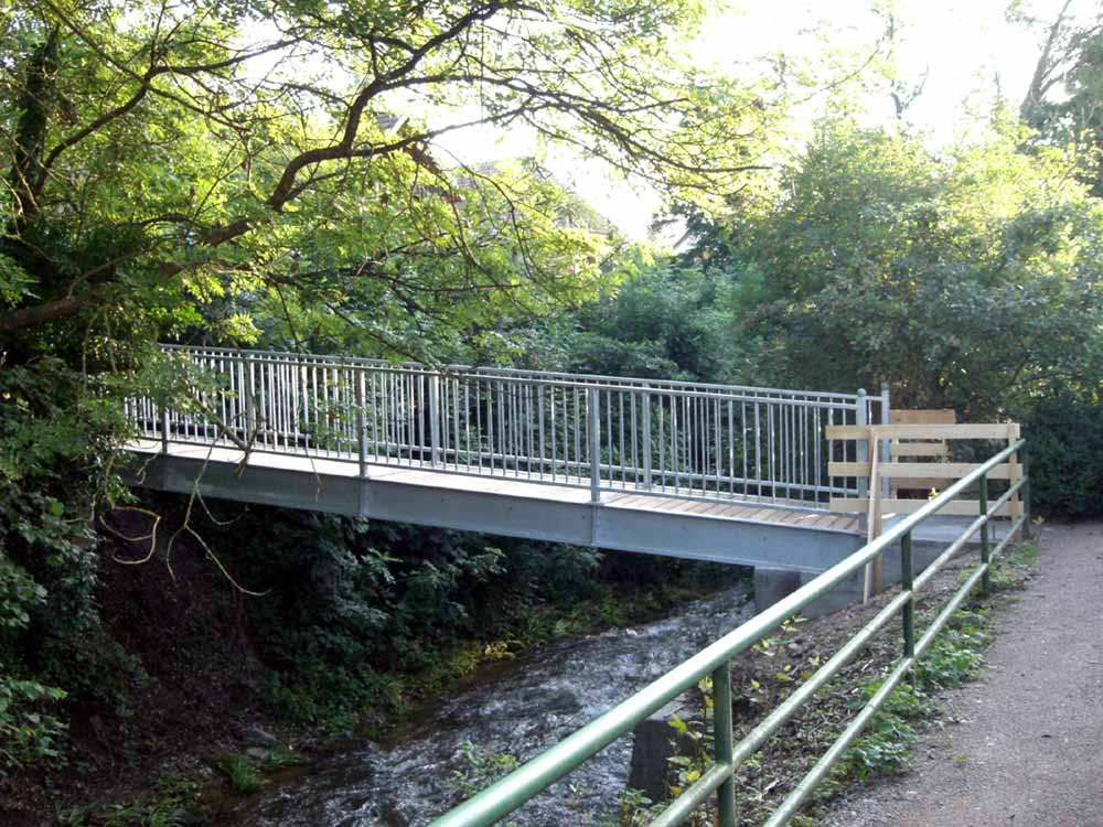 Die Brücke wurde von einem örtlichen Stahlbaubetrieb im Auftrag der Stadt Müllheim produziert und nach Absprache zwischen Stadt Müllheim und dem Stahlbaubetrieb durch das THW Müllheim, Fachgruppe Brückenbau installiert / montiert.