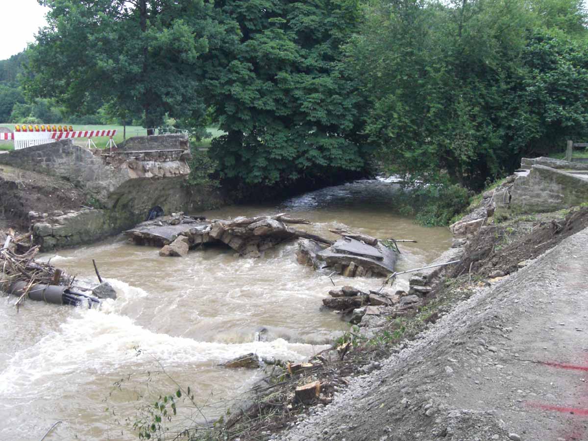 eine ganze Zeit lang die historische Steinbrücke, die beim Hochwasser in der Nacht zum Dienstag von den Fluten zerstört worden war. Nach den städtischen Unterlagen stammte die alte Doppelbogenbrücke aus dem Jahr 1818; dieses Datum sei auch in einem Stein