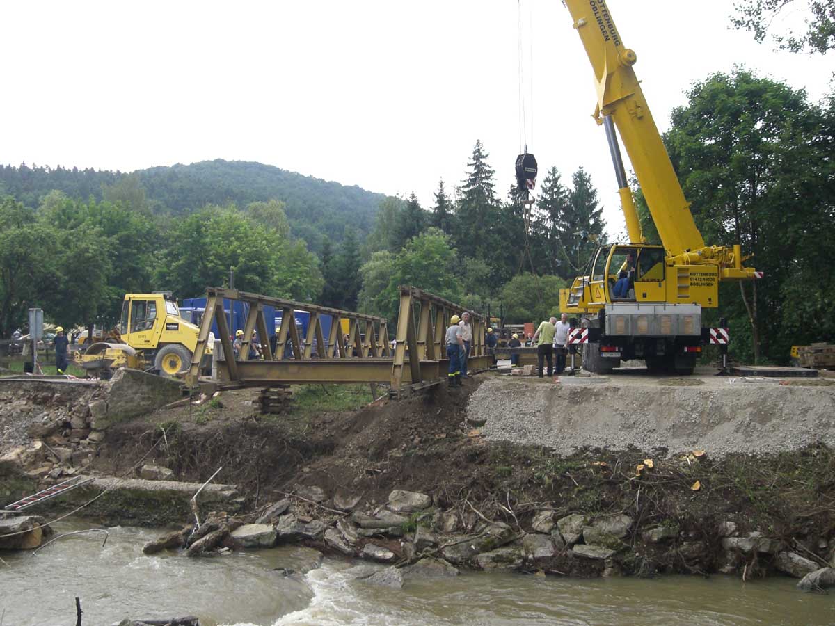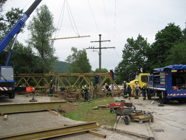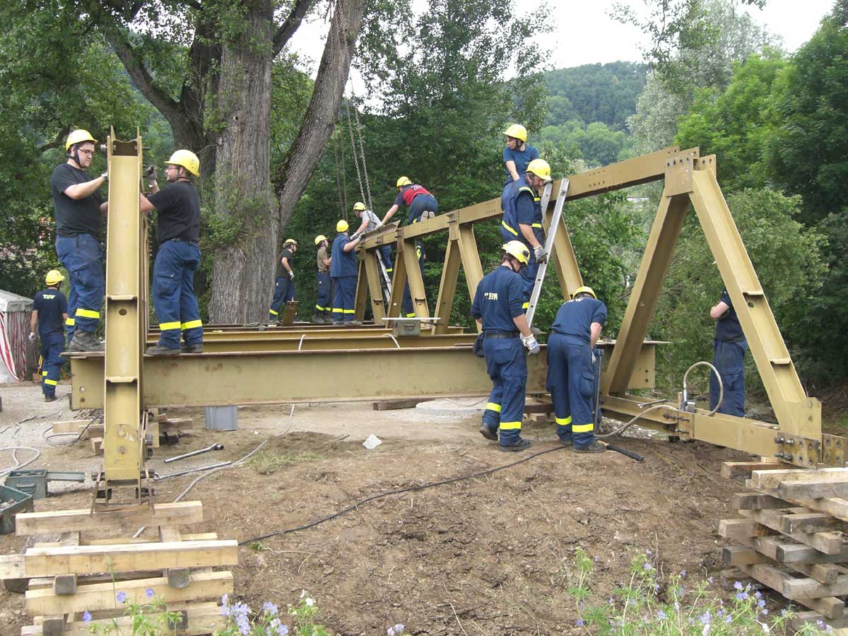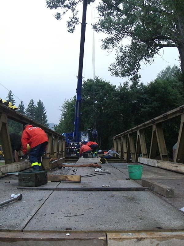 Uhr begann die Fachgruppe mit dem Zusammenbau des stählernen Brücken-Fachwerks. Bis nach Mitternacht wurde gearbeitet, Sonntag Vormittag machten die THWler ihren Part fertig. Heute werden die Zufahrten durch die Stadt geschottert, gegen Abend soll die Brücke befahrbar sein,