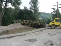 Behelfsbrücke am Abend schließlich über dem Fluss lag und an die provisorisch planierten Rampen angedockt war. Sie ersetzt nun für