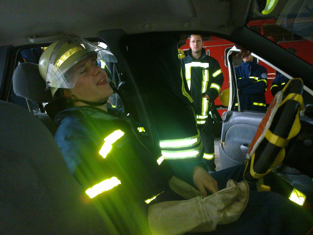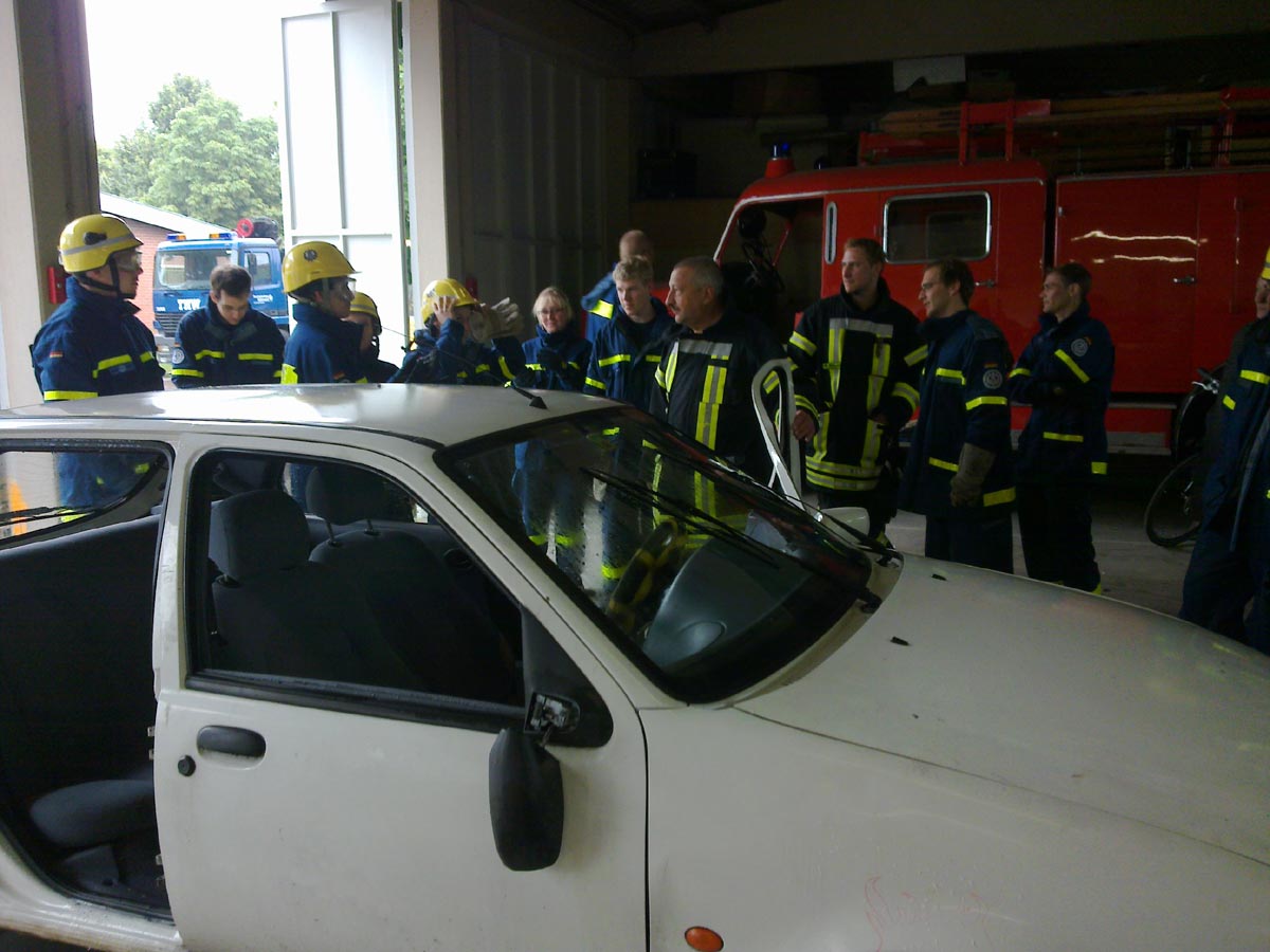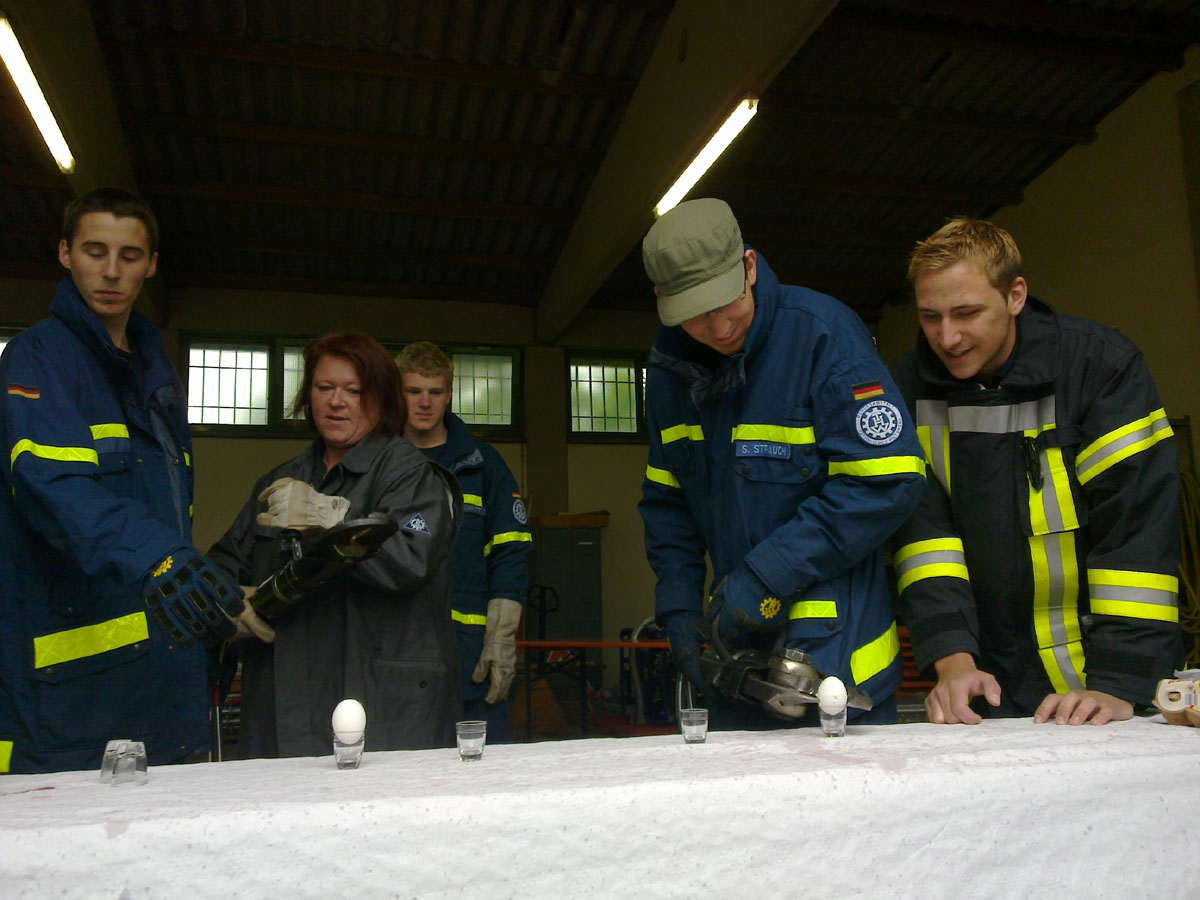 Am Samstag, den 19. Juni 2010, wurden die Helfer des OV Müllheim durch drei Angehörige der Feuerwehr Neuenburg im Umgang mit dem hydraulischen Rettungsgerät geschult. Die Erfahrenen Feuerwehrkräfte begannen zunächst mit einem Geschicklichkeitsspiel, bei dem rohe Eier mit den schweren Geräten transportiert werden mussten. Nachdem sich die Helfer an den Umgang gewöhnt hatten, wurde an einem bereitgestellten Kraftfahrzeug die Rettung eines Verletzten Schritt für Schritt geprobt. Das Entfernen der Scheiben und der Türen sowie das Wegziehen des Lenkrades wurde durchgeführt. Dabei wurde besonderes Augenmerk auf die Airbags gelegt. Diese stellen für Rettungskräfte eine besondere Gefahr dar. Zum Abschluss wurde am Kraftfahrzeug das Dach entfernt und der Verletzte sachgerecht geborgen. Insgesamt eine rundum gelungene Ausbildung, für deren hervorragende Durchführung der Feuerwehr Neuenburg und Ihren Ausbildern ein großer Dank gebührt.