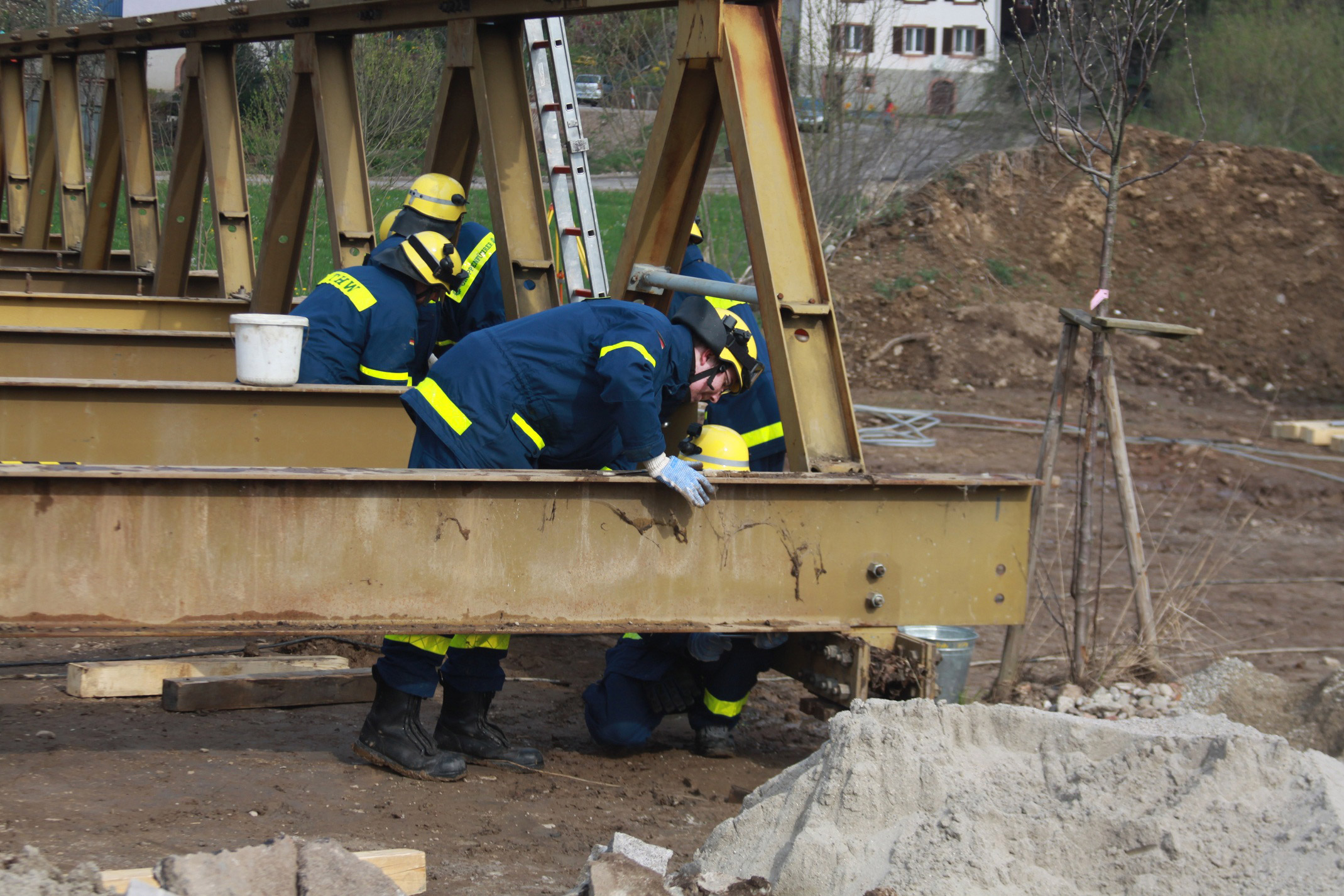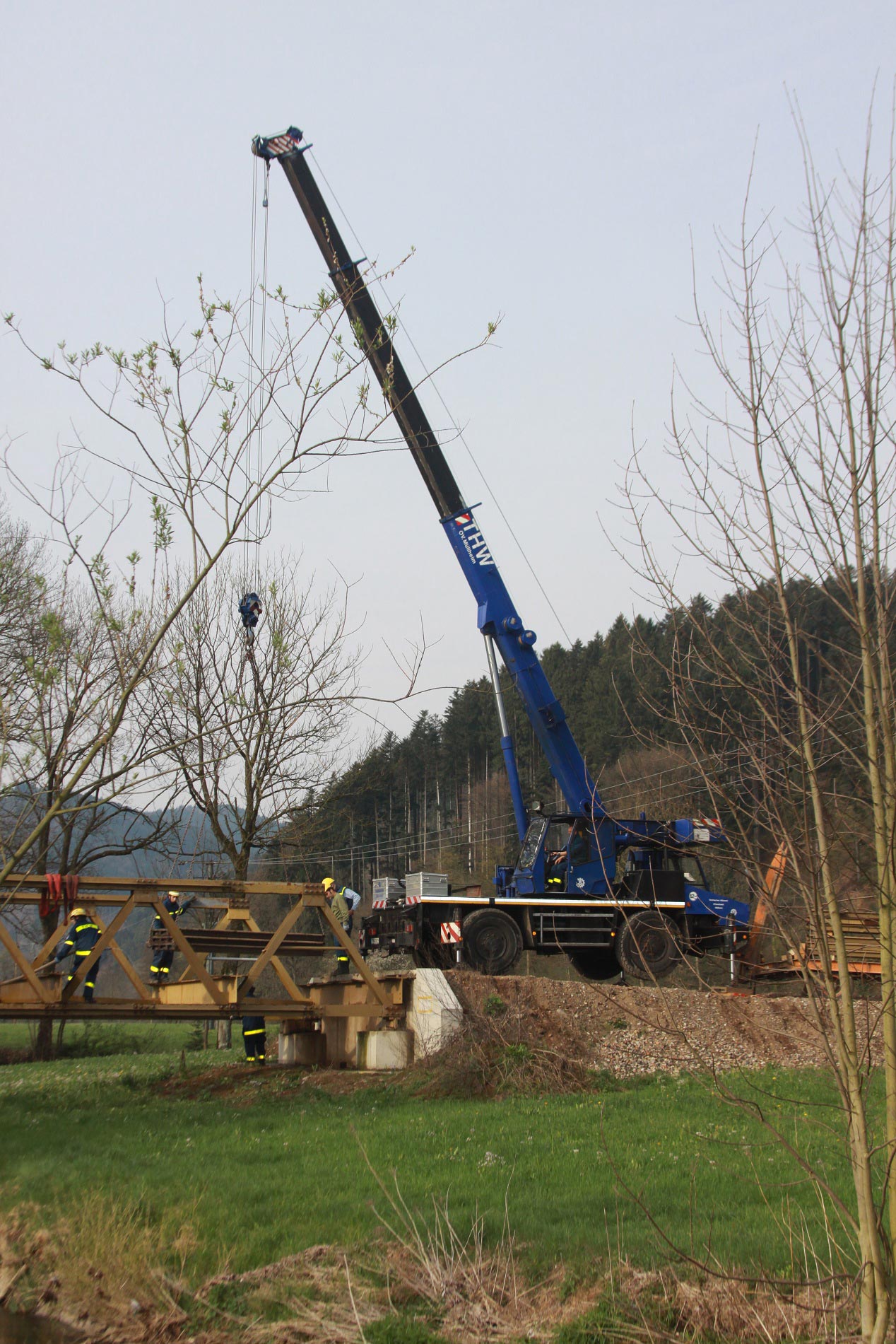 So wurde die einspurige Behelfsbrücke mit einer freien Stützweite von 27,45 Metern in Niederwinden im April diesen Jahres mit einer gemischten Einsatzmannschaft der Ortsverbände Müllheim und Emmendingen erfolgreich zurückgebaut.