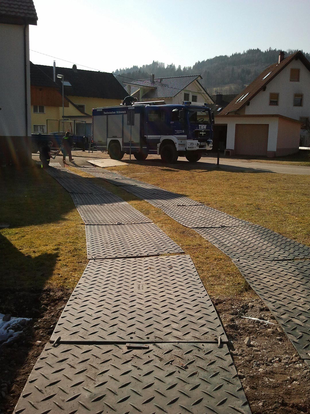Für die Zufahrt von Feuerwehr und Rettungsdienst in ein Wohngebiet im Elztal wurde ein Notstraßensystem über eine Länge von ca. 60 Metern verlegt und verankert. Dies war die praktische Feuertaufe der sogenannten Überfahrplatten, nachdem das THW Müllheim bereits im Zuge einer Projektarbeit der Fachgruppen Brückenbau im Auftrag der THW-Leitung diese Überfahrplatten zur Herstellung von Notstrassen getestet hatte.